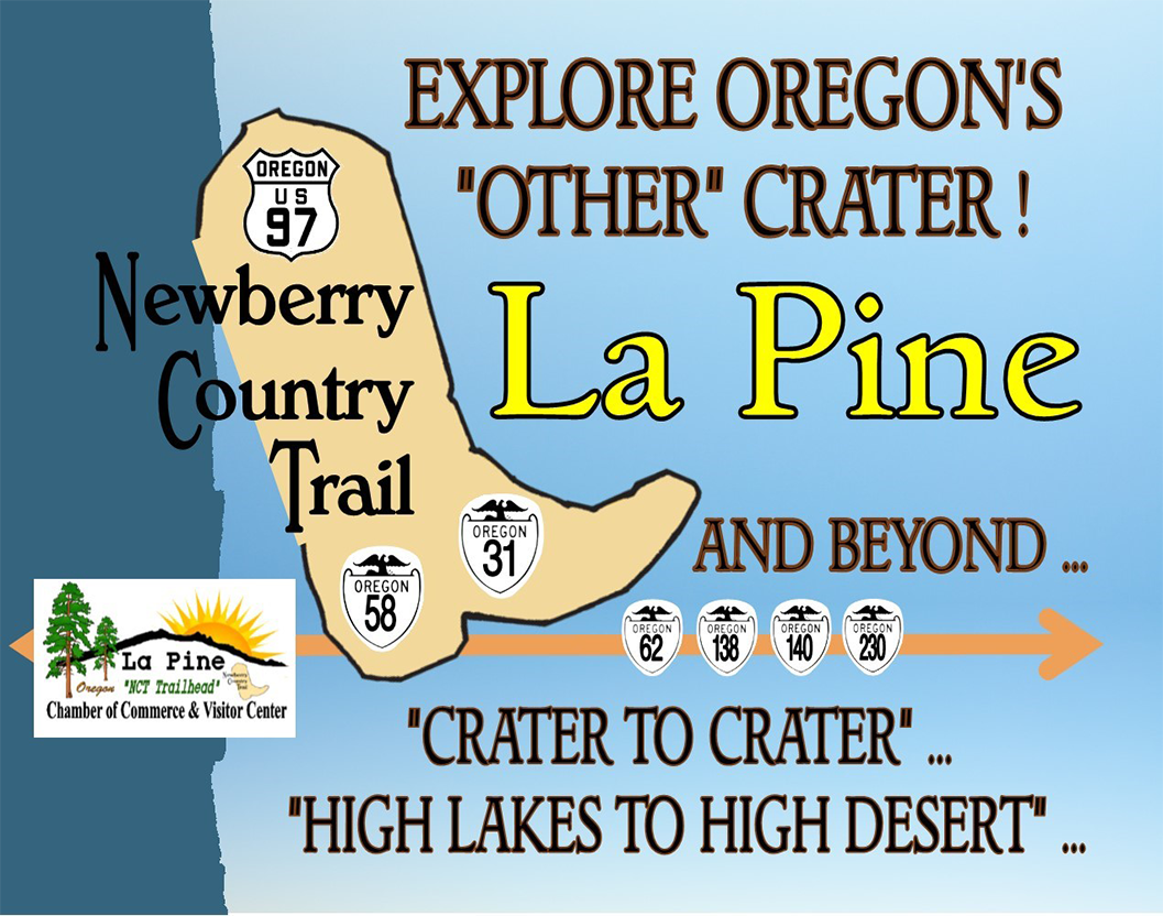 LA PINE CHAMBER OF COMMERCE (HWY 97, 61 miles to Crater Lake) – The City of La Pine, south of Bend on HWY 97, welcomes you to Family-friendly driving adventures. La Pine offers “Loop” tours for Newberry Crater- Oregon’s other Crater! Explore the Crater Lake Loop: from La Pine down Hwy 97 via Train Mountain and historic Fort Klamath to Crater Lake, Union Creek, Shady Cove and north to Diamond Lake, returning by Hwy 97. The High Lakes Loop explores Sunriver and local lakes. The High Desert Loop (Outback!) takes you east to Fort Rock State Park, Heritage Village Museum, Christmas Valley, Silver Lake, Summer Lake, and Paisley. Find more information info at the La Pine Chamber and Visitor Center or go online www.lapine.org. Location: 51429 Huntington Rd, La Pine OR 97739, phone: 541-536-9771